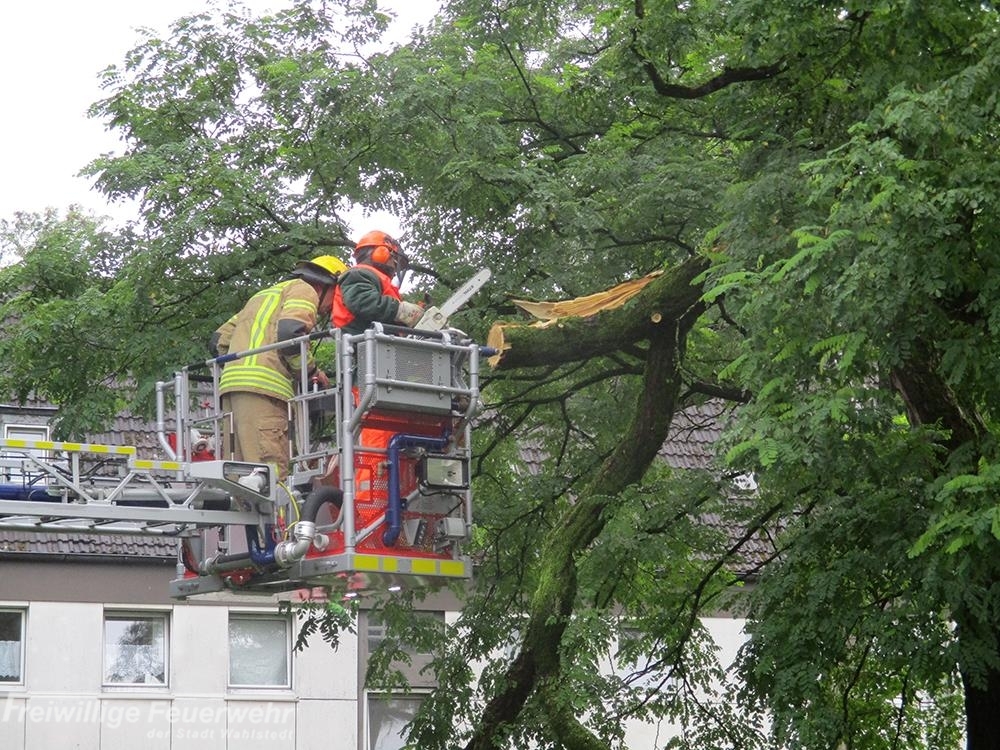 Der in ca. 4 m Höhe hängende Ast wurde von einem Kettensägenführer über die Drehleiter beseitigt.