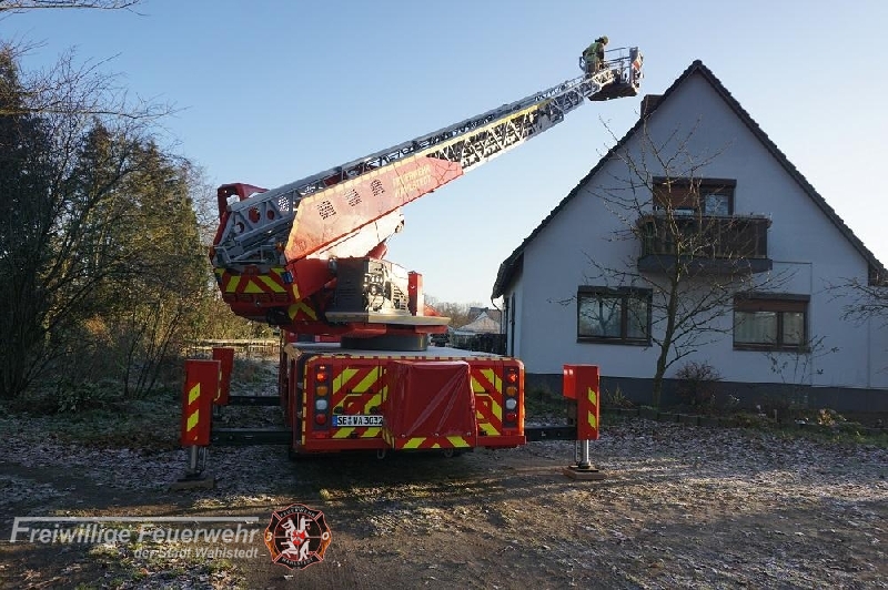 Eine Bürgerin bat die Feuerwehr nach Inbetriebnahme ihres Kamins um Hilfe. Mit der Drehleiter wurde der Schornstein kontrolliert. Es stellte sich heraus, dass vermutlich ein Vogel ein Nest im Schornstein bauen wollte und diesen mit zahlreichen Ästen verstopft hat. Die Äste wurden durch einen Feuerwehrmann entfernt.