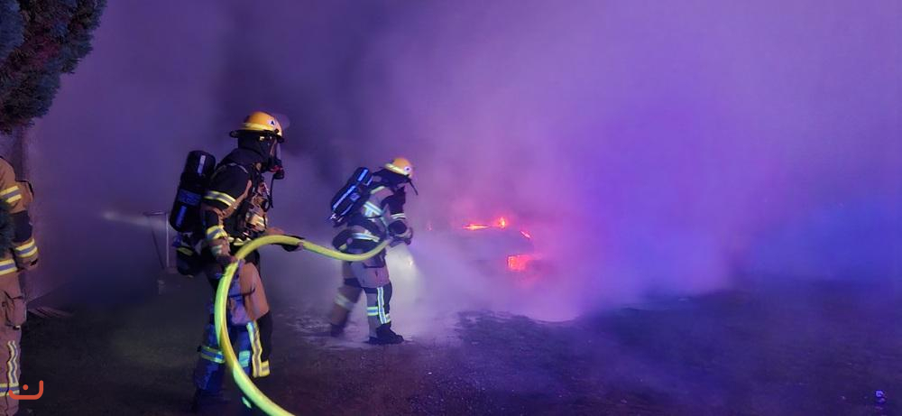 Gleich mehrere Anrufer meldeten der Kooperativen Regionalleitstelle West einen in Vollbrand stehenden Personenkraftwagen an einer Garage.