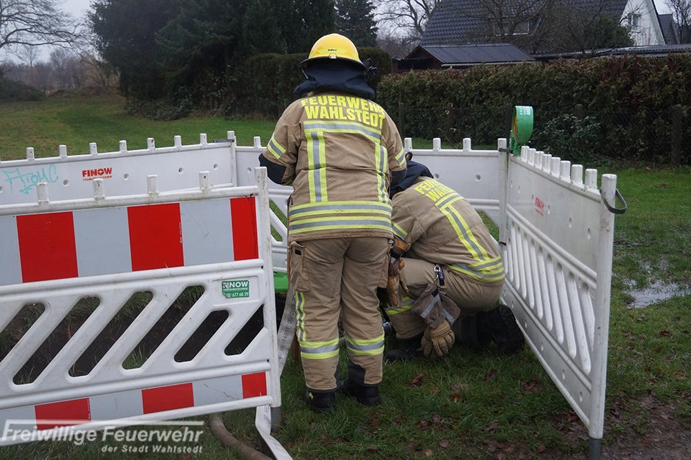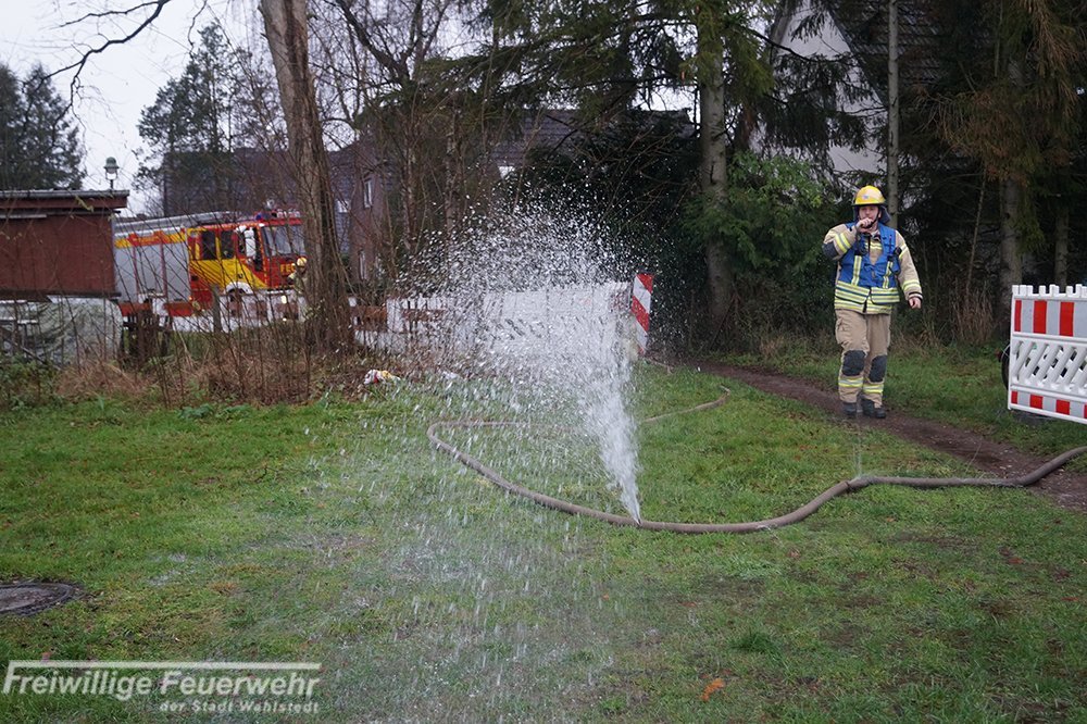 Der Leitstelle Holstein wurde eine ca. 2 Meter hohe Wasserfontäne gemeldet. Beim Eintreffen der Feuerwehr standen Teile des Rüßweges bereits unter Wasser. Bei der Erkundung stellte sich heraus, dass ein geplatzter C-Schlauch Auslöser für die Fontäne war.